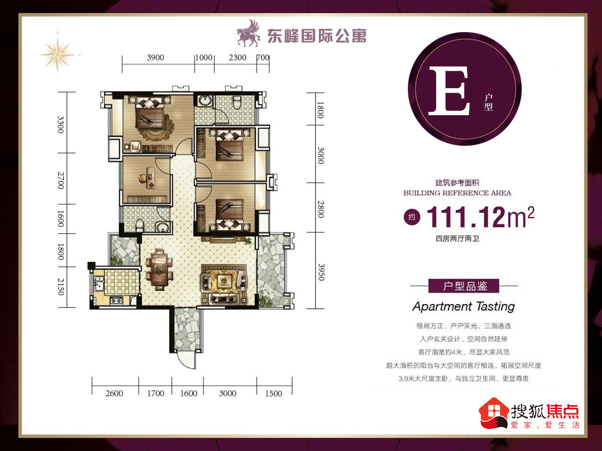 4室2厅2卫-E户型 建面约94平 四室两厅