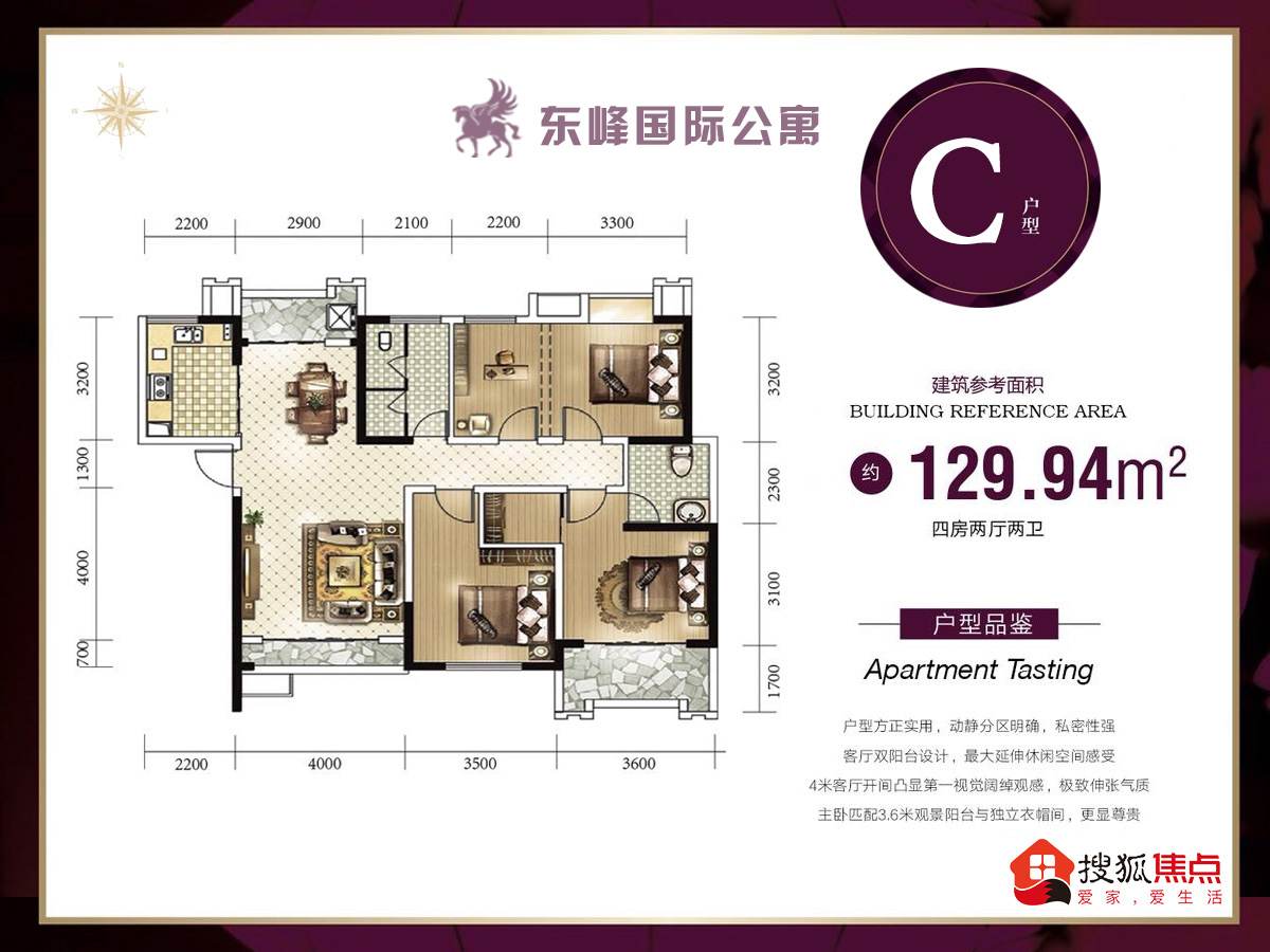 4室2厅2卫-C户型 建面约129平 四室两厅