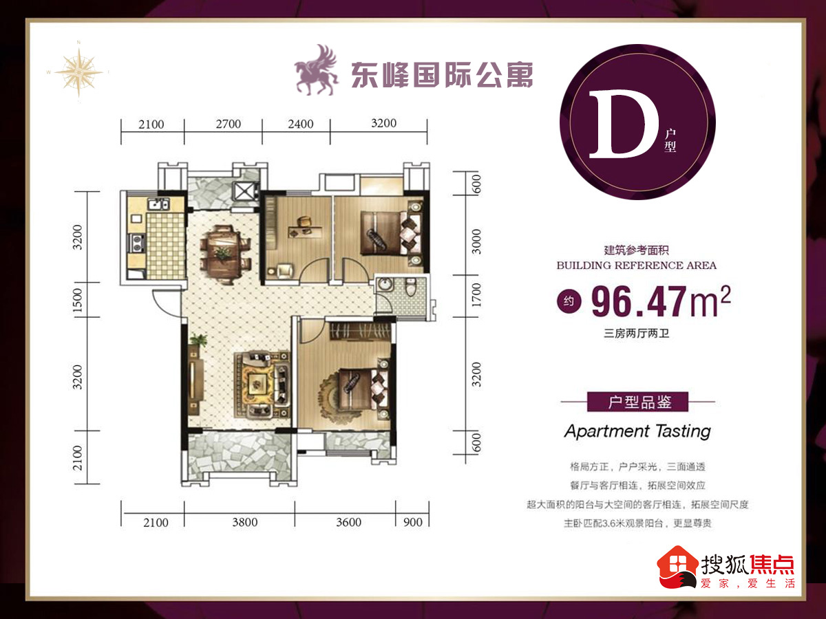 3室2厅2卫-D户型 建面约94平 三室两厅