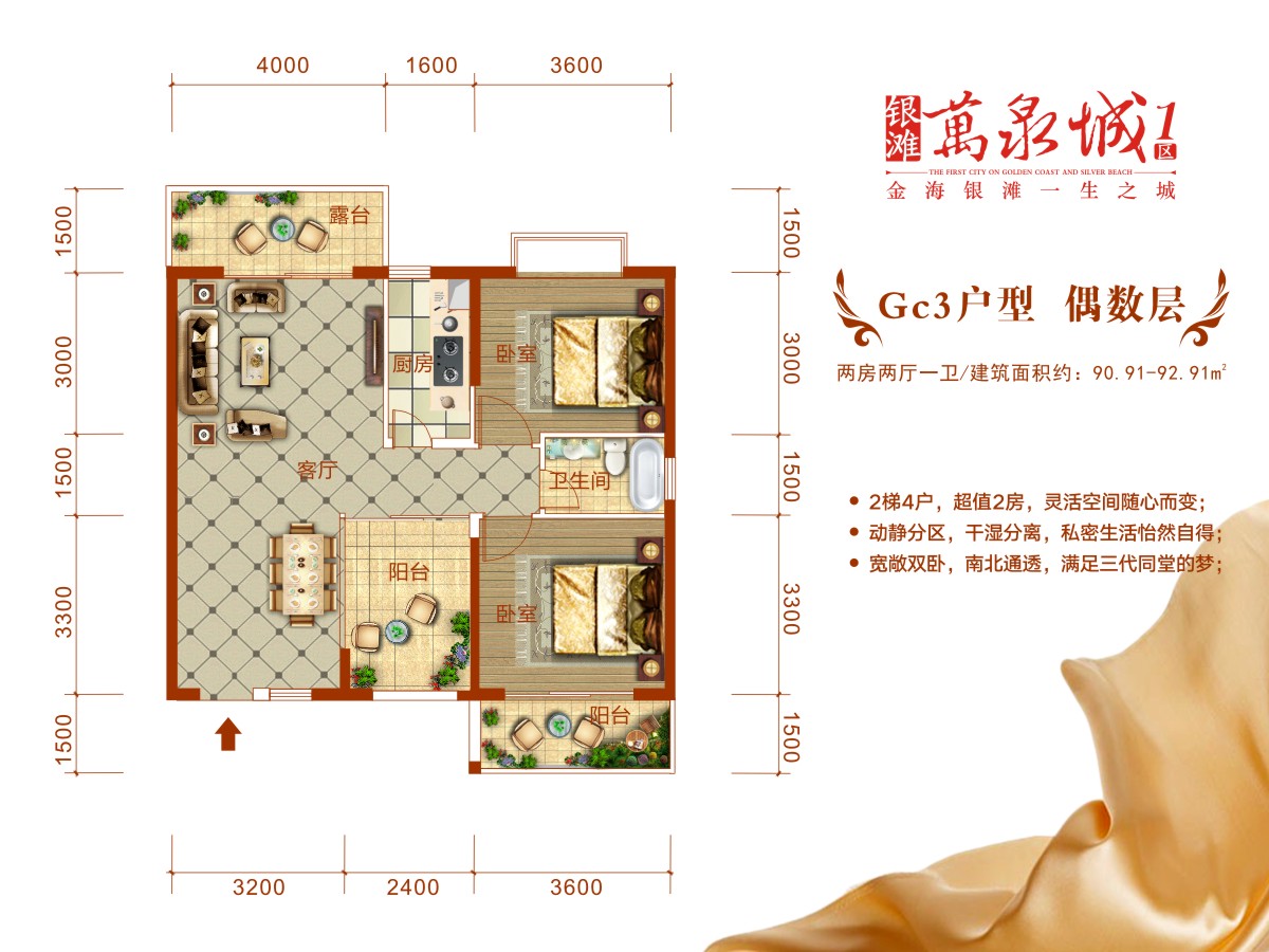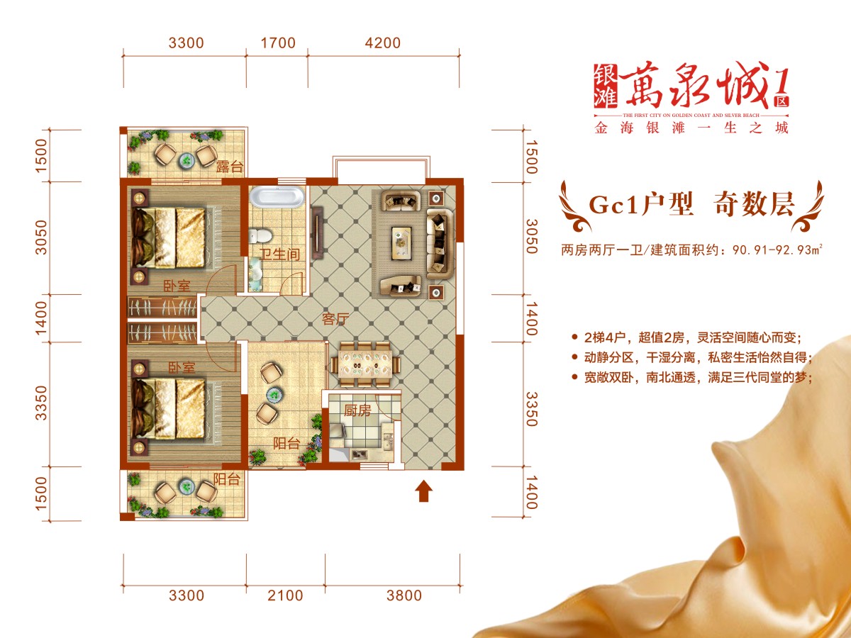 2室2厅1卫-Gc1户型 建面约90-93平 二房二厅