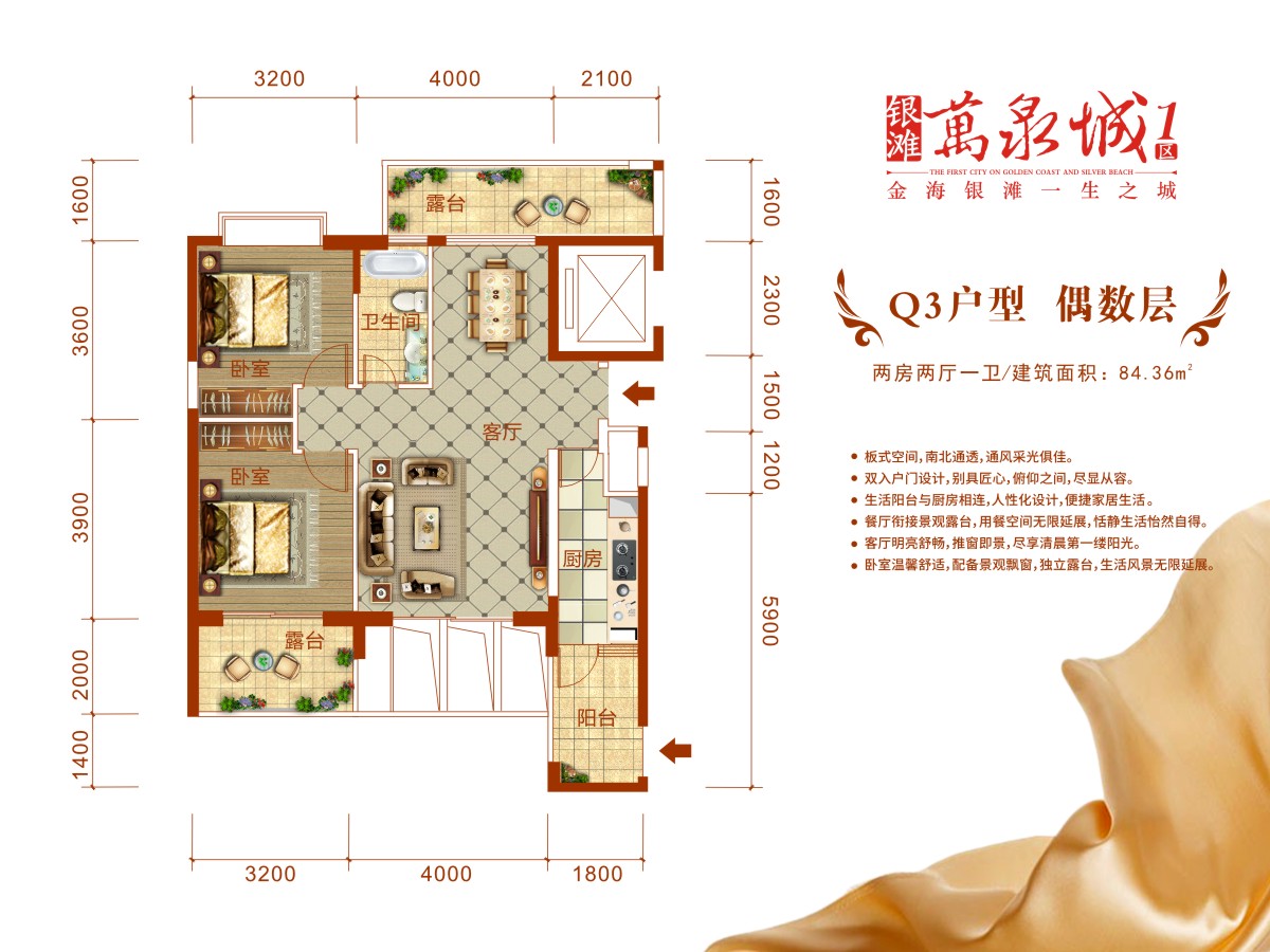 2室2厅1卫-Q3户型 建面约84平 二房二厅