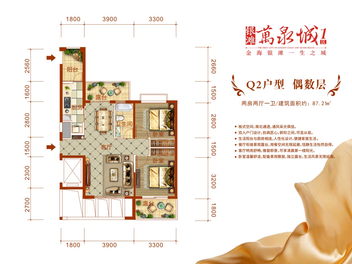 2室2厅1卫-Q2户型 建面约87平 二房二厅