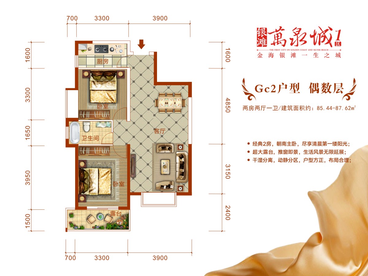 2室2厅1卫-Gc2户型 建面约85-88平 二房二厅