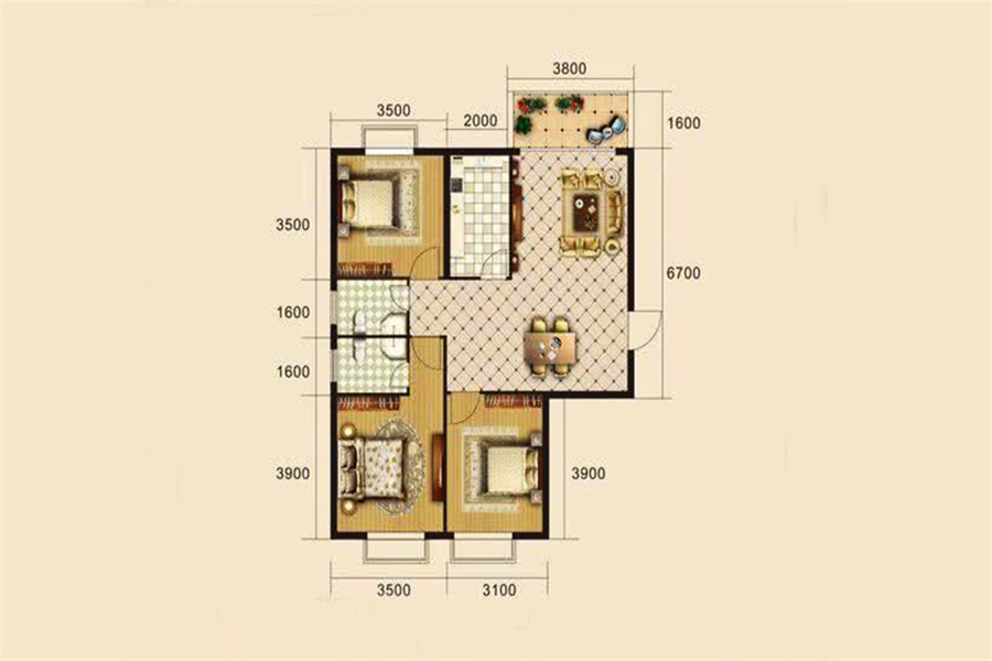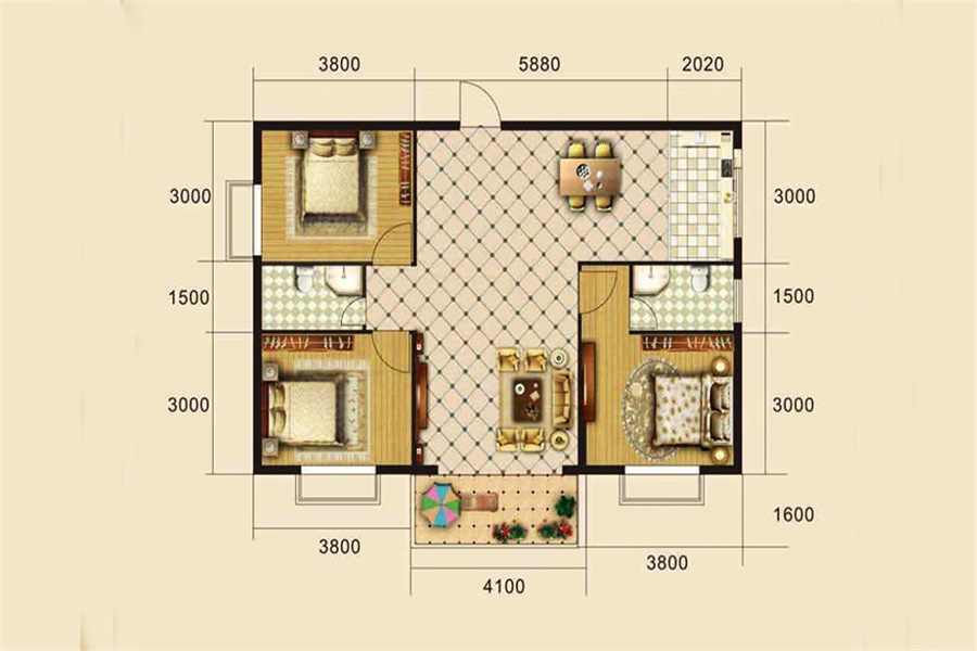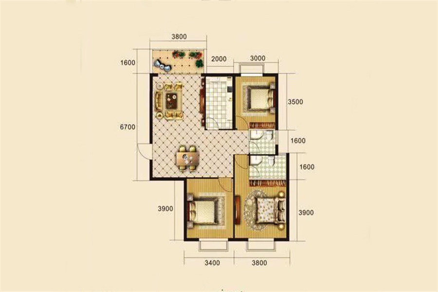 3室2厅1卫-B4户型(三室二厅95.87㎡)