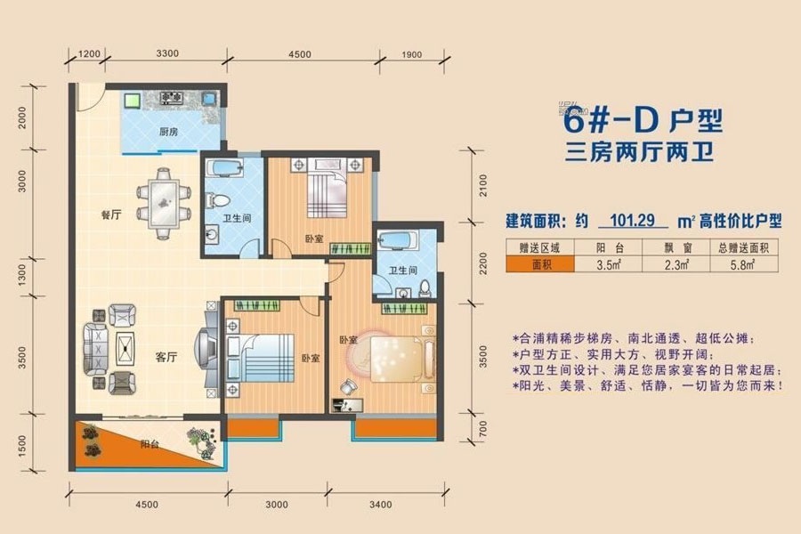 3室2厅2卫-D户型 建面约101平 三房两厅