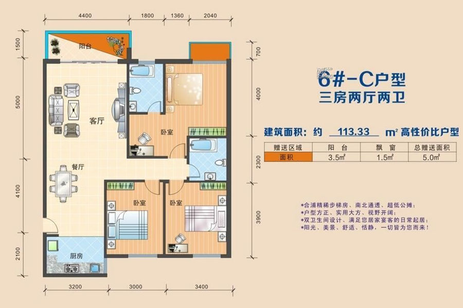3室2厅2卫-C户型 建面约118平 三房两厅