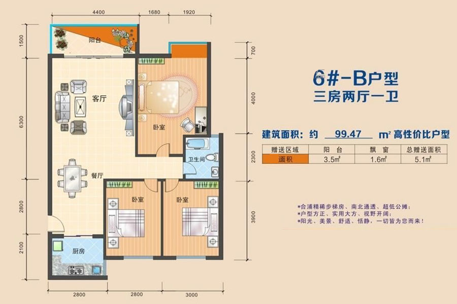 3室2厅1卫-B户型 建面约99平 三房两厅