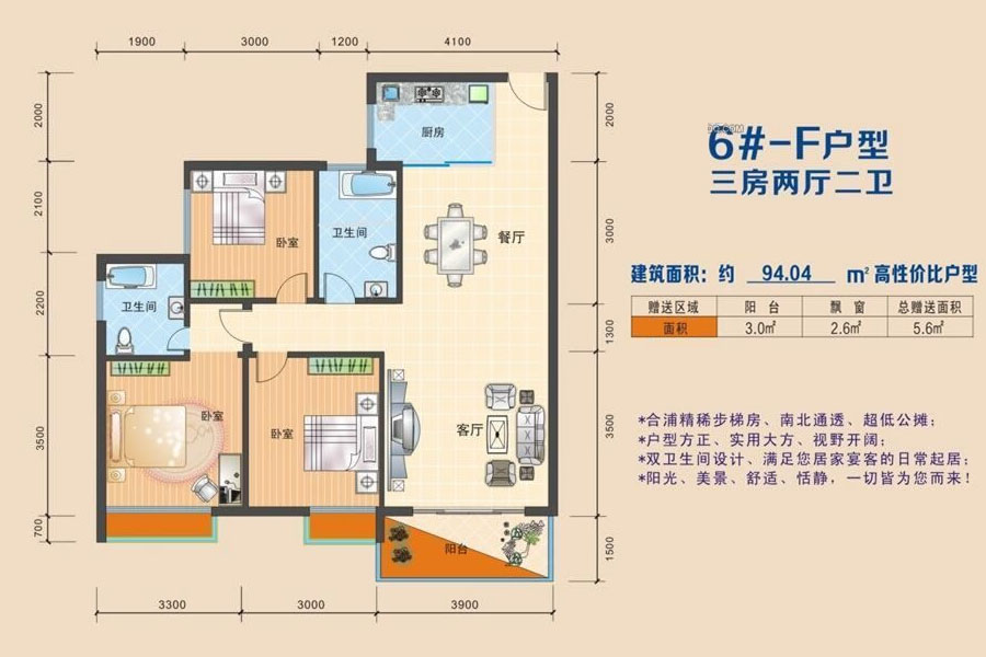 3室2厅1卫-F户型 建面约94平 三房两厅
