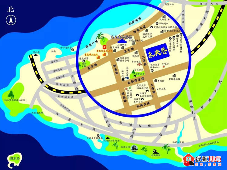 中小学:六小,二小,二中,六中、国发中学、北海电大。 综合商场:东都百汇 医院:北海市人民医院、妇幼保健院、北海二院 银行:中国建设银行、邮政银行