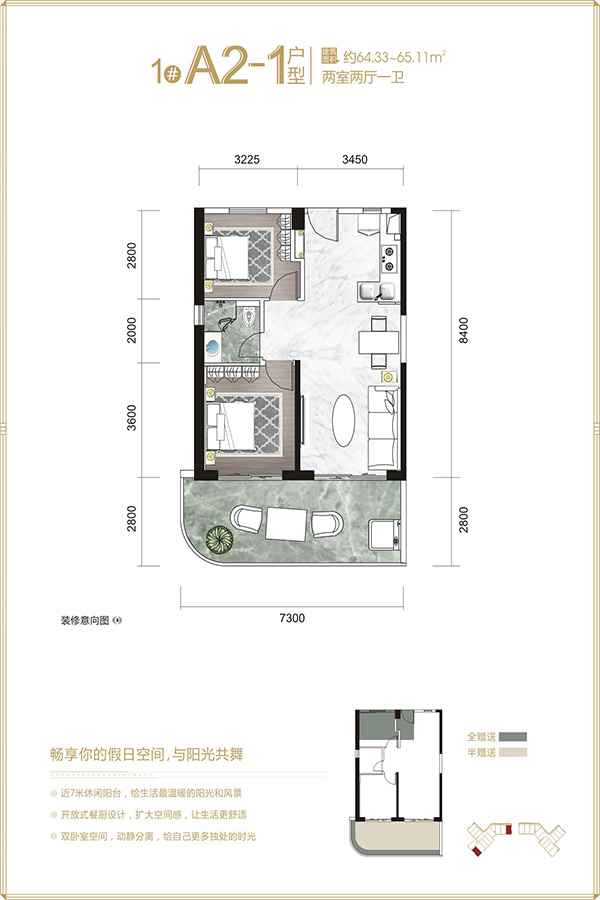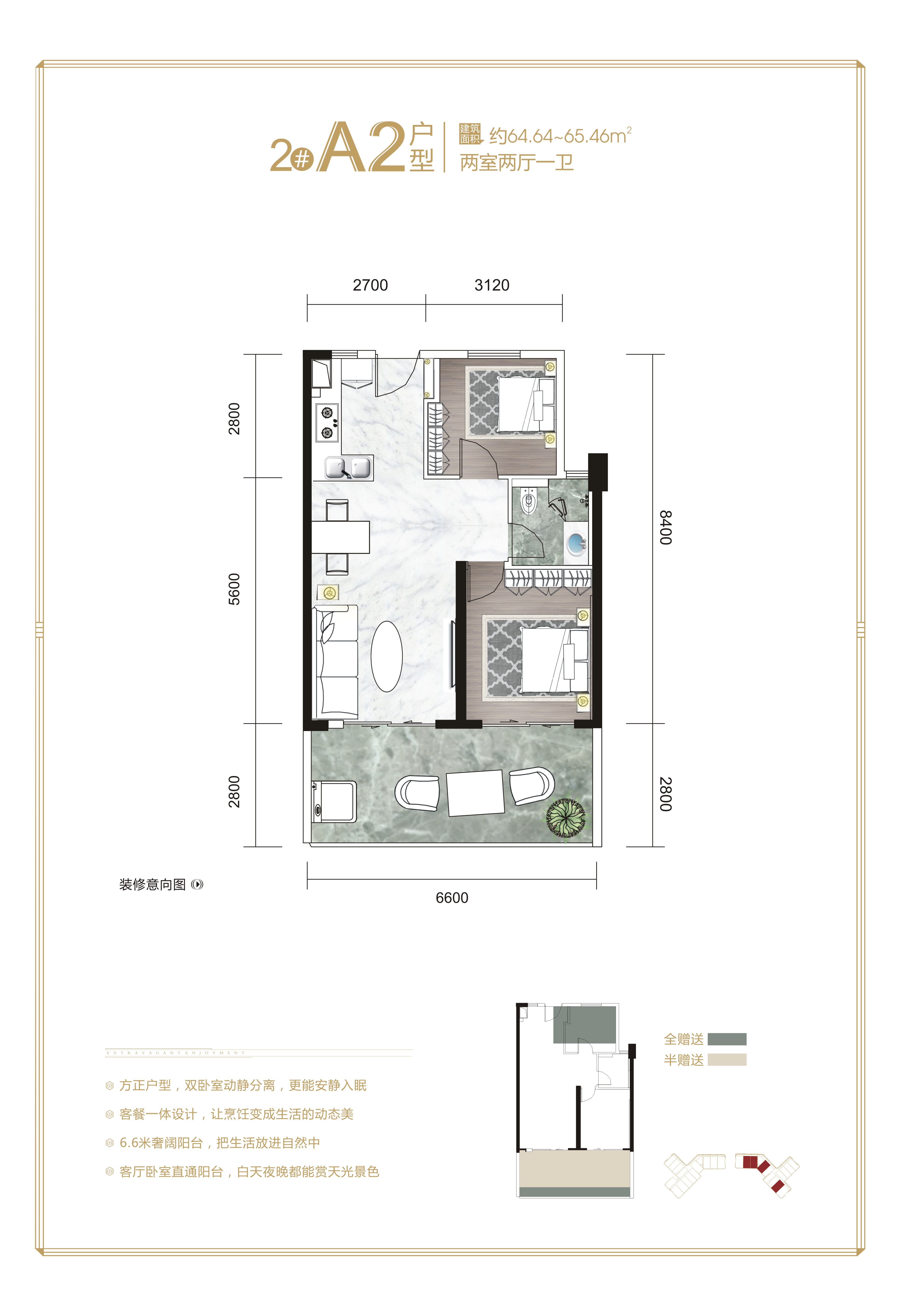 2室2厅1卫-金悦湾 建面65.46平2#A2户型两室