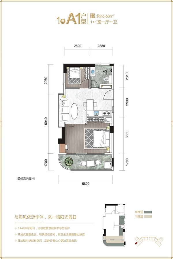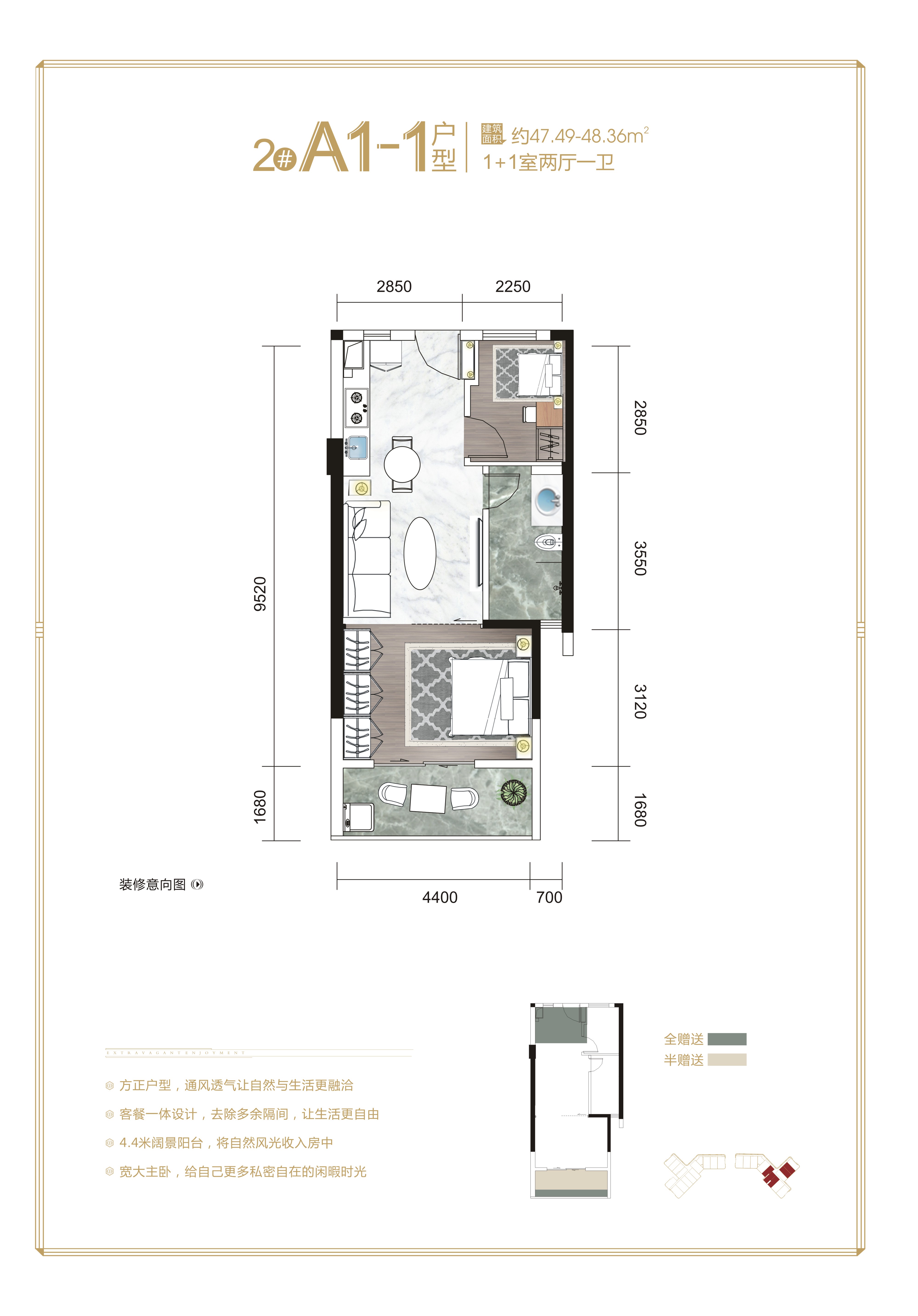 2室1厅1卫-金悦湾1#A1户型1+1室一厅一卫