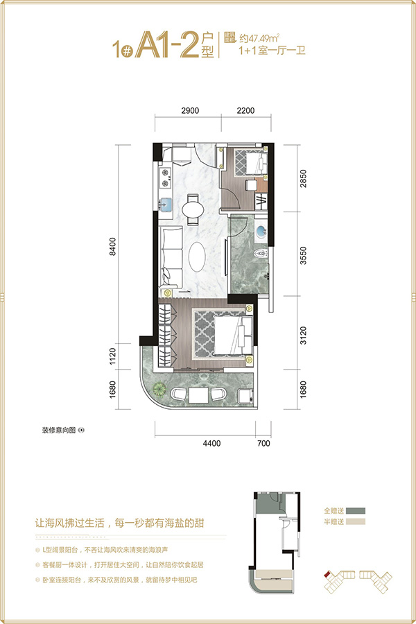 2室1厅1卫-金悦湾1#A1-2户型1+1室一厅一卫