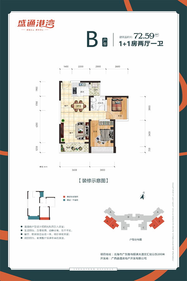 2室2厅1卫-盛通港湾B户型72.59平1+1房两厅
