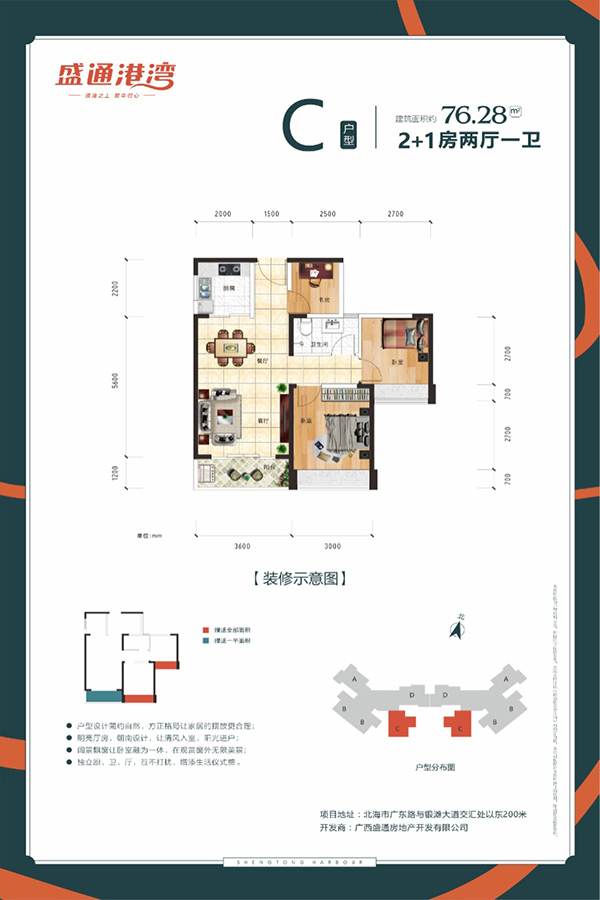 3室2厅1卫-盛通港湾C户型76.28平2+1房两厅