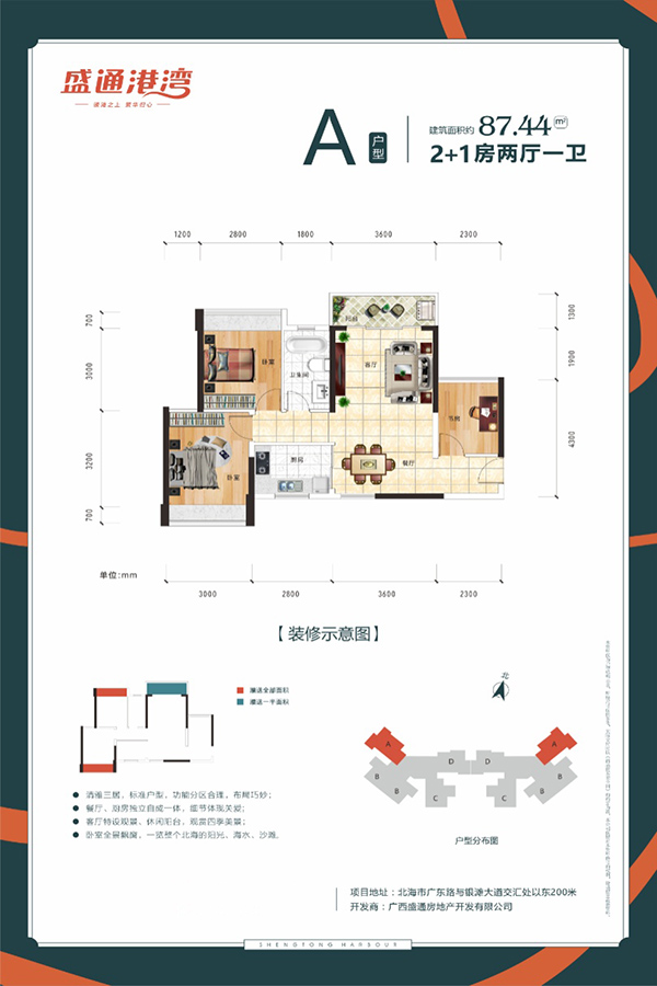 3室2厅1卫-盛通港湾A户型87.44平2+1房两厅