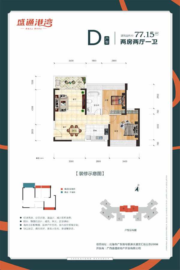 2室2厅1卫-盛通港湾D户型77.15平两房两厅