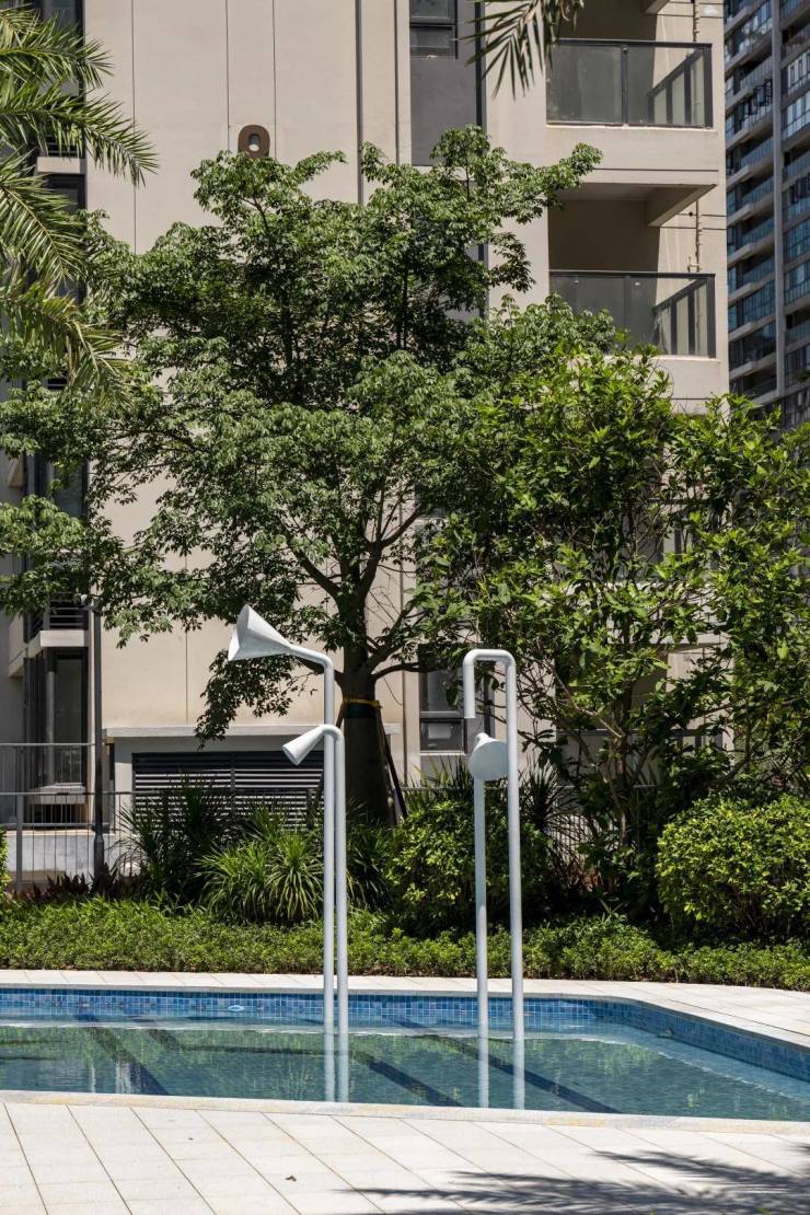 项目采用围合式布局,共享景观最大化,实现户户有景,部分楼栋享泳池景观。部分楼栋楼下即寻鲲泳池,消暑不远行,夏日享清凉。 项目打造四季雨林主题园林,匠造五感社区,从“成长、社交、 运动、自由、艺术“五大维度,营造四季24小时沉浸式美学生活场。