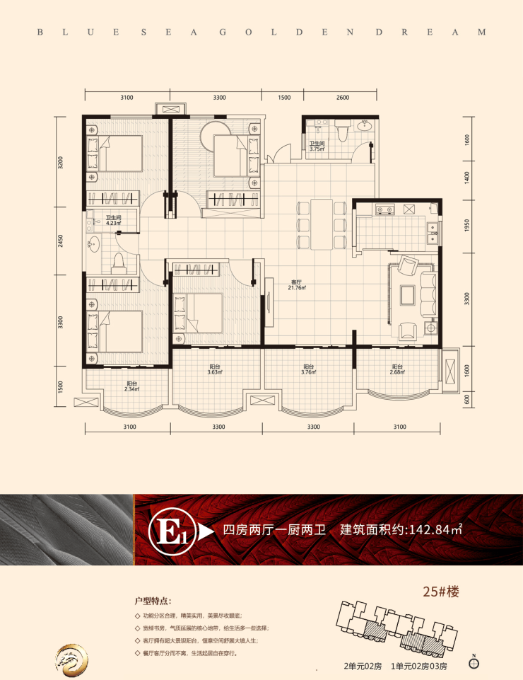 E1户型 建面约142.84㎡,四房两厅两卫
