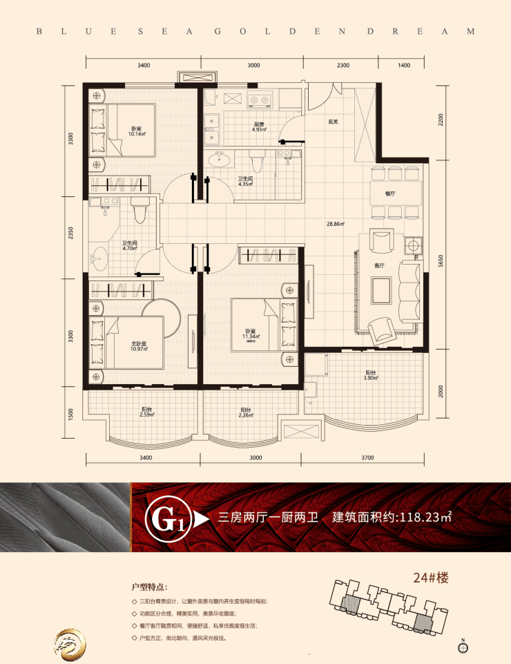G1户型 建面约118.23㎡ 三房两厅两卫