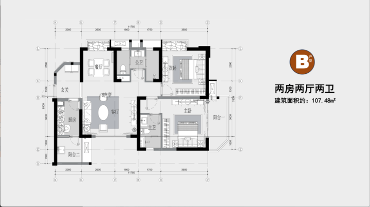 B户型:107.48㎡|两房两厅两卫