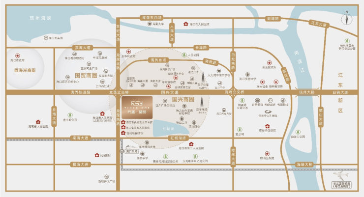 3大城市主干道:国兴大道、龙昆南路、海秀快速路交汇,约4公里可达国贸老城区、海口东站、汽车客运总站,5公里辐射海口核心商圈,经机场联络线约20公里到达美兰国际机场。