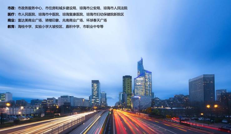 项目临近城市主干道金海路,享市级醇熟配套,5公里范围内教育、医疗、产业、商业等配套资源齐全,项目西侧将建设琼海首个城市湿地公园,一站式满足日常生活所需。