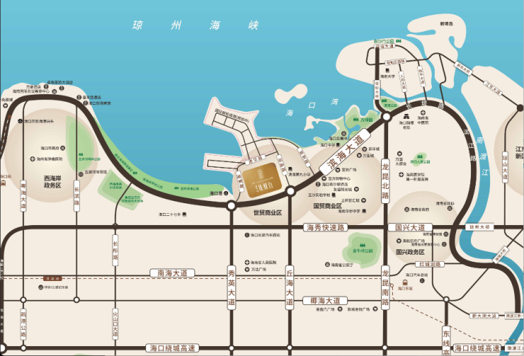 3. 比邻城市动脉,便捷通达全岛:比邻滨海大道,西至西海岸,东至丘海大道、龙昆北路,海秀快速路(约3km)、海口东站(约6.5km)、海口火车站(约13.4km)、美兰国际机场(约19km)。