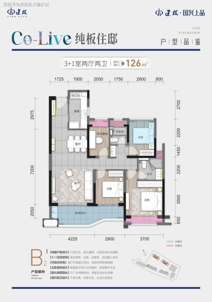 住宅:1#-4# 为纯板式花园住宅,采用南北通透板楼布局,形成围合超大花园,户型设计上有建面约 106㎡三房、126㎡四房、141㎡四房等多种选择,空间方正实用,纯板设计,双入户大堂,高得房率,户户南北通透10。