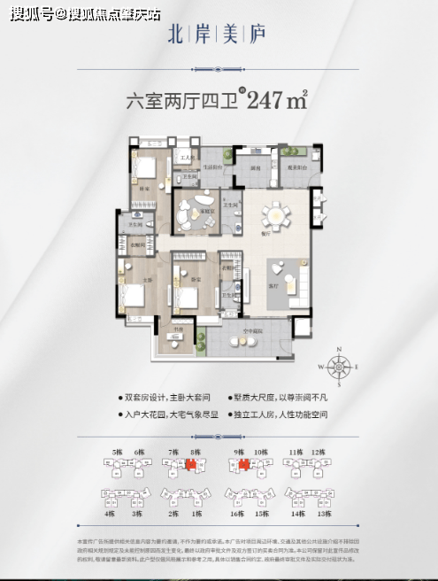 247㎡产品是全南向六室两厅四卫户型设计,是项目的楼王单元,占据最好景观视野,奢阔的尺度、人性化的格局,不但能满足三代同堂的舒适居住需求,还有可以进行个性化定制的富裕空间,无不彰显主人家的气度和底蕴。