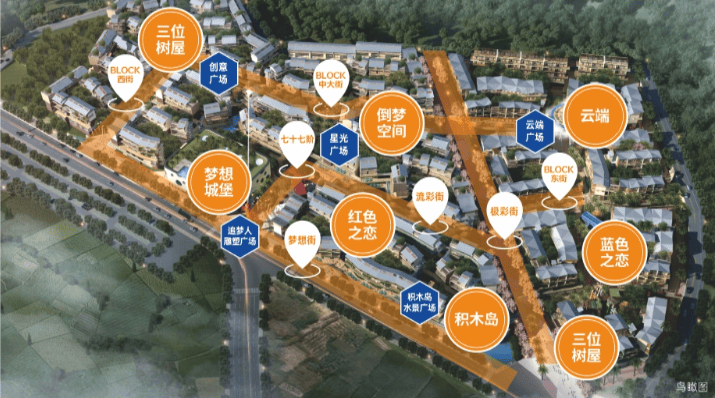 小镇通过积木岛、梦想城堡、云端、红色之恋、蓝色之恋、三位树屋、水下隐室、倒梦空间八大奇异建筑,汇聚顶尖品牌,打造科技馆、儿童乐园、婚恋主题馆、心灵修养馆等多元业态于一体的商业美学空间,是集网红打卡与商业场景并存的心地标。