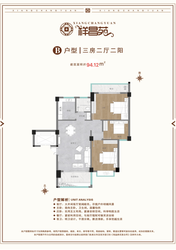 B户型:94.12㎡三房两厅一卫,户型方正,南北通透,明厨明卫,大阳台。