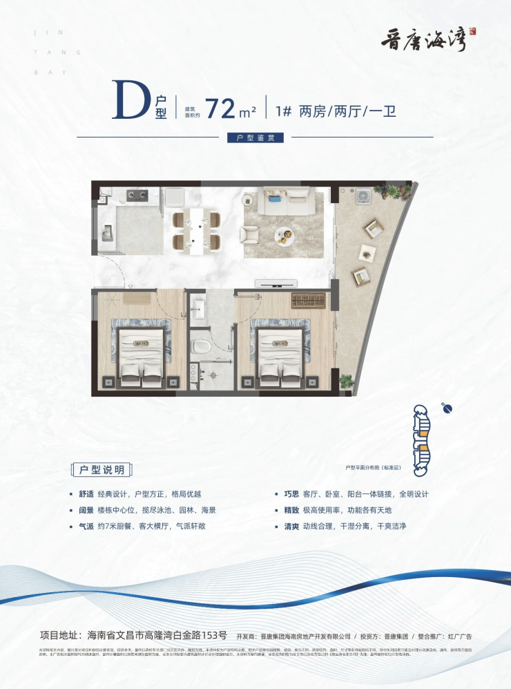 项目总占地200亩,总建筑面积18万㎡,由2栋超豪华临海酒店、7栋高颜值退台式住宅建筑、10栋现代滨海特色风情商业街组成,小区总户数2021户。容积率1.15,绿化率高达60%,楼间距约100米,5层及以上户户观海,是高隆湾观海率最高的住区。项目内打造8万㎡风情园林、8000㎡一站式商业街、景观双泳池、4.7米层高休闲娱乐中心等全龄层丰富配套,是理想海居一生之城。
