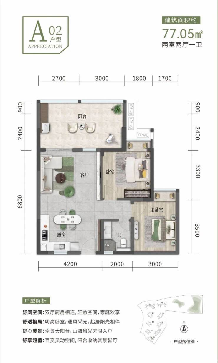 建筑面积约69-104㎡一至三房,方正开阔空间,户户阳台,动静分离,功能分区,厨房、阳台等多功能配套,全能居家,旅居休憩或家庭度假皆可。