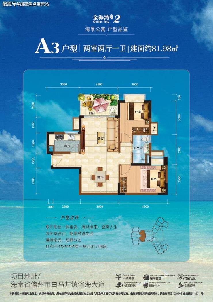 在海南限购政策前规划获批的低于100平米的稀缺小户型,设计精巧,明厨明卫,1.8米超宽大阳台,141米超宽楼间距。