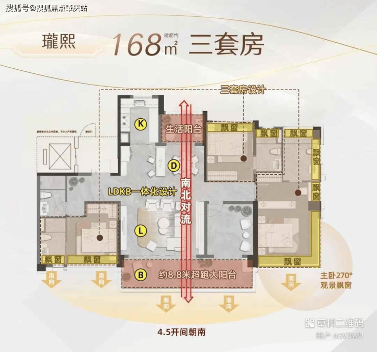 设计上,户户单边位,阳台率30%,有意思的是,168㎡(含)以上户型都有3个套房。