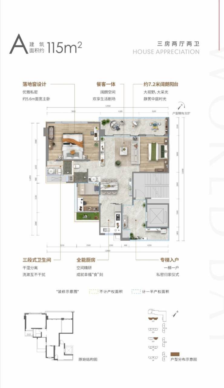 🏠A户型: 约115㎡三房两厅两卫、层高22层