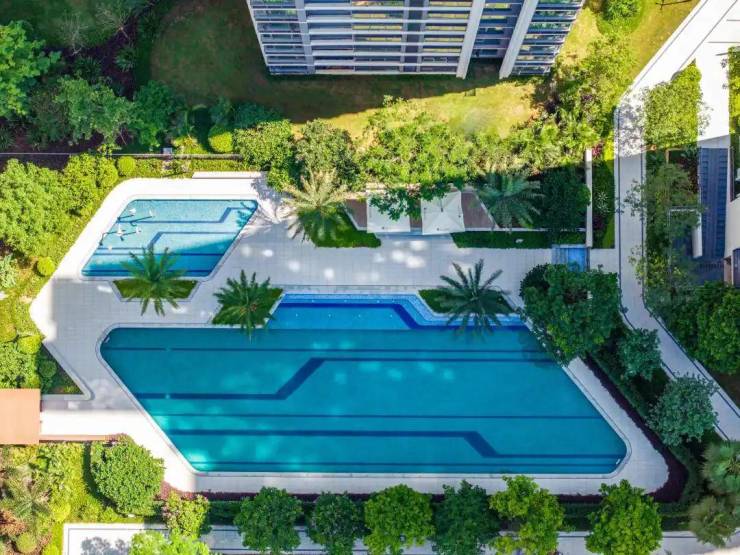 项目采用围合式布局,共享景观最大化,实现户户有景,部分楼栋享泳池景观。部分楼栋楼下即寻鲲泳池,消暑不远行,夏日享清凉。 项目打造四季雨林主题园林,匠造五感社区,从“成长、社交、 运动、自由、艺术“五大维度,营造四季24小时沉浸式美学生活场。