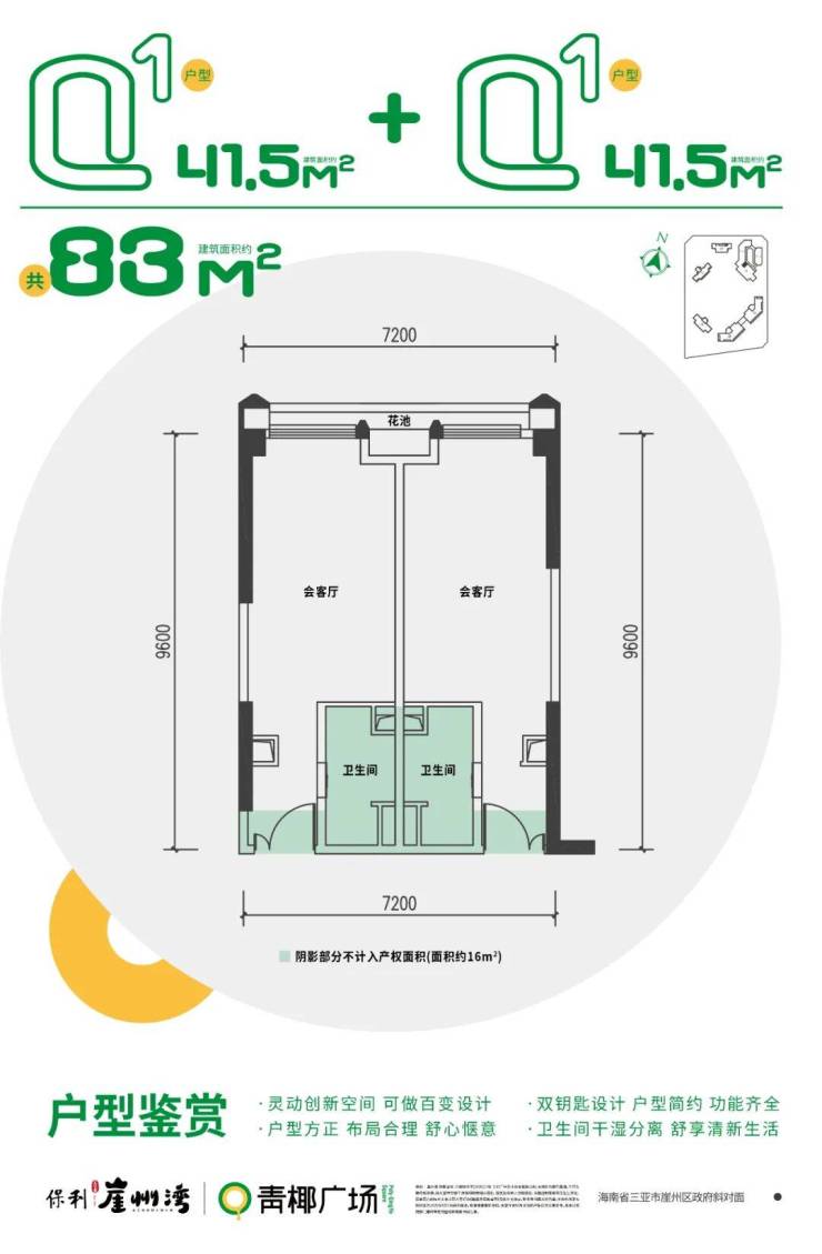 项目配套:约7000㎡商业广场、5万㎡沿街商业、精品酒店、47亩崖州生态公园、健康游泳池、社区服务中心等。