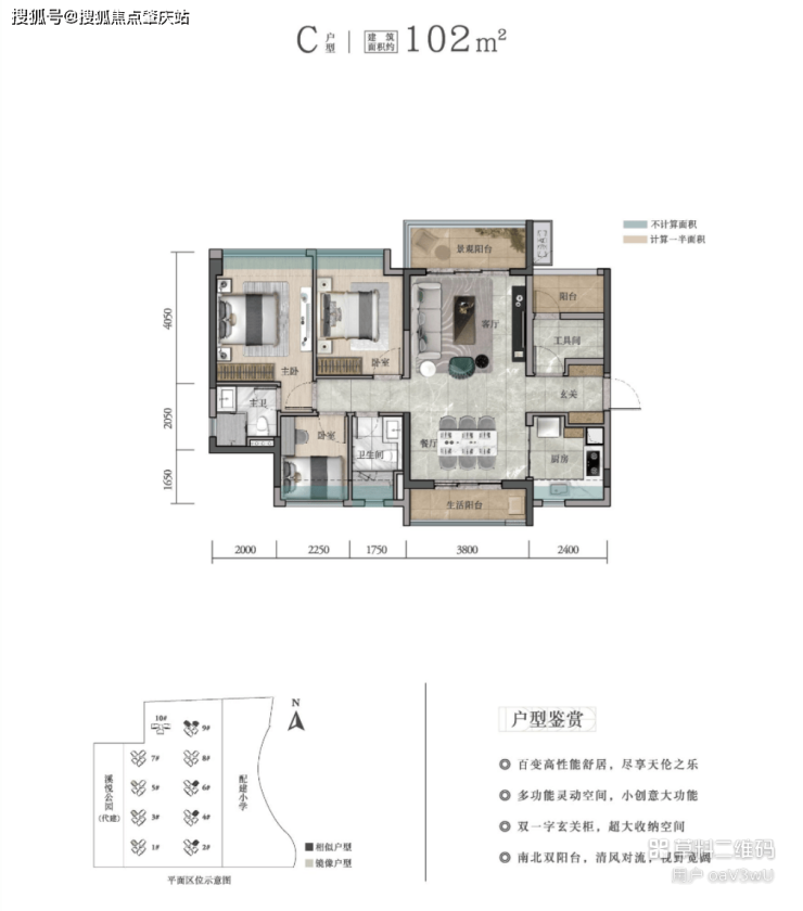【户户朝南 无遮挡】全区户户朝南无遮挡设计,楼栋黄金比例45°角错开排布,三开间及四开间朝南,极致采光;