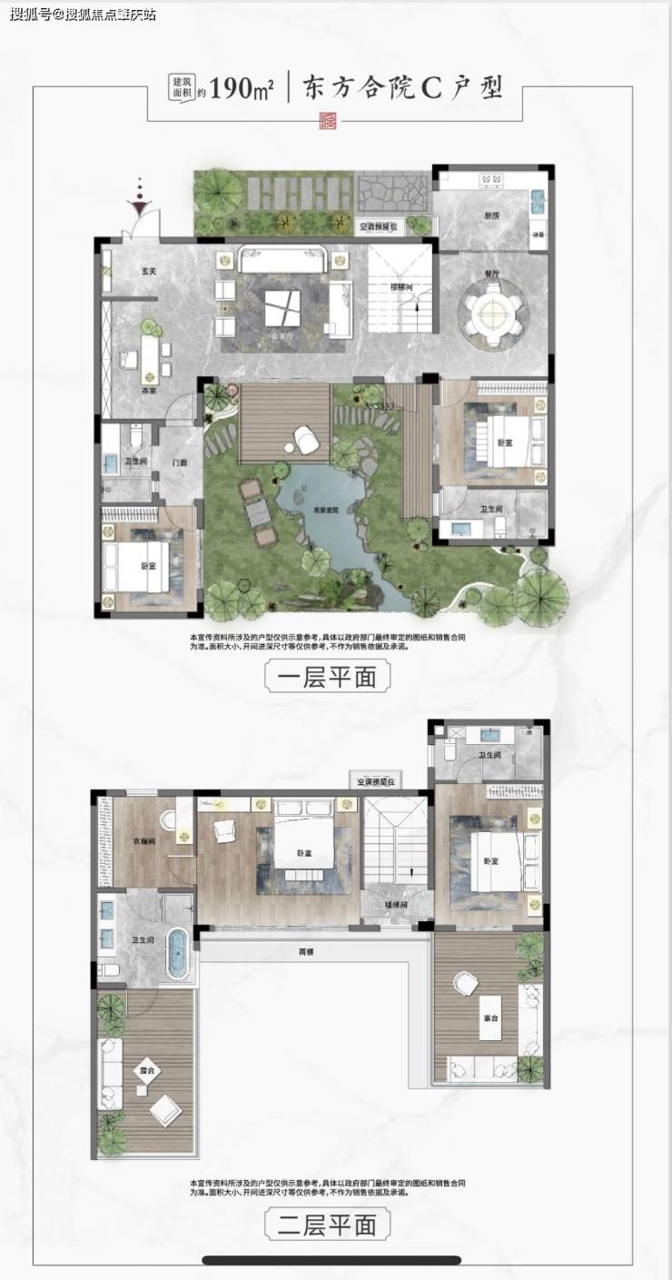 合院:中国传统四合院户型基底,共同岭南归家巷道,风车式布局,起承邻里空间,独门独院,前庭后院,有天有地密围合对称合院。两层设计,做到14米大宽厅,双套间双露台,每个房间看中心园林,庭院约60方左右。