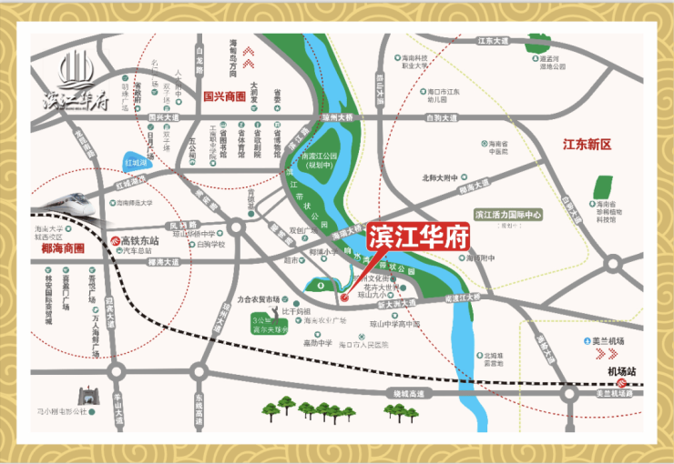项目位于海口市琼山区滨江西路南段(南渡江大桥以南400米),与江东新区隔江相望,椰海大道、新大洲大道、滨江路三条主干线环抱项目,且与海口美兰机场、高铁东站距离皆在半小时圈内,交通便捷,出入无忧。