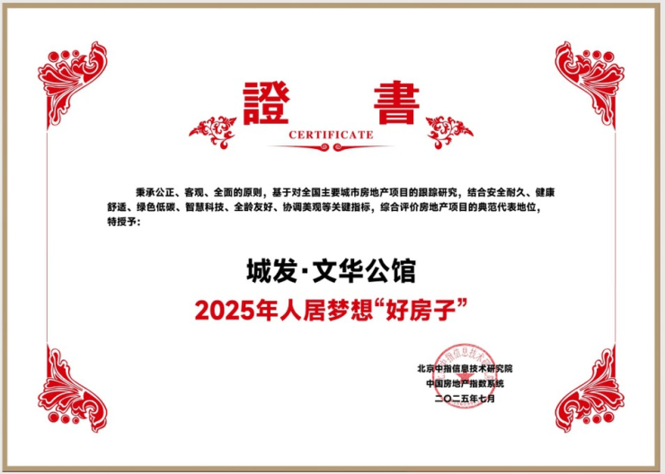 2025年7月4日,城发·文华公馆凭借卓越硬核实力与前瞻的人居理念,荣膺由中指研究院颁发的【2025年人居梦想“好房子”】,成为践行国家“好房子”标准的品质人居典范。