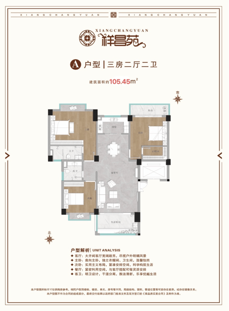 户型为面积94㎡-105㎡的三房,南北通透,户型方正,利用率高,而且横厅设计、宽大景观阳台,非常的舒适。