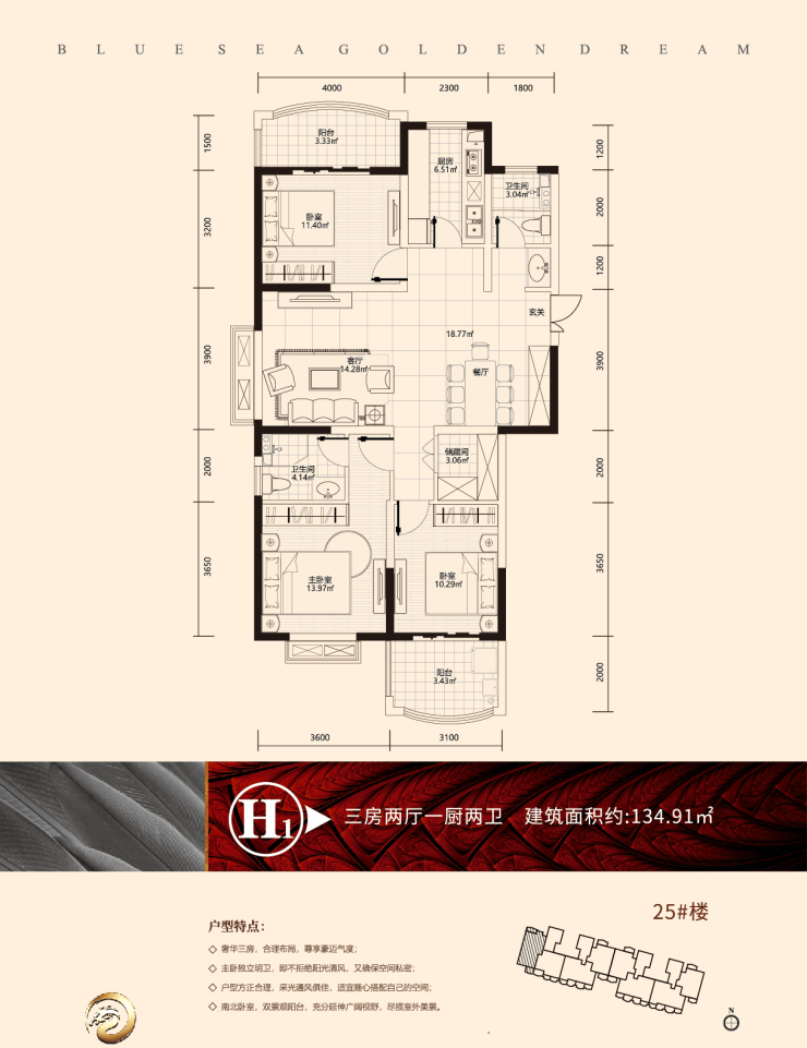 H1户型 建面约134.91㎡ 三房两厅两卫