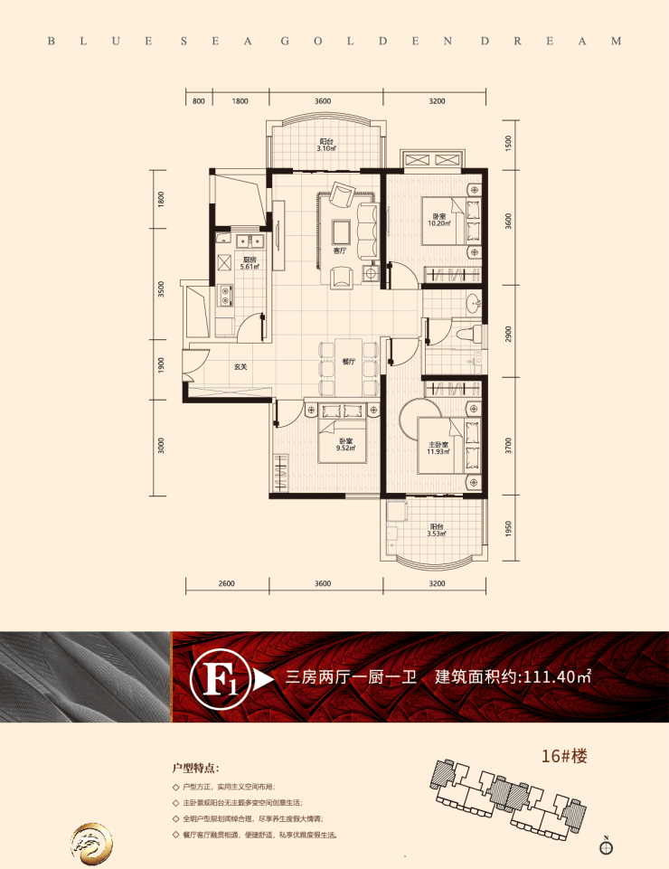 F1户型 建面约111.4㎡ 三房两厅一卫