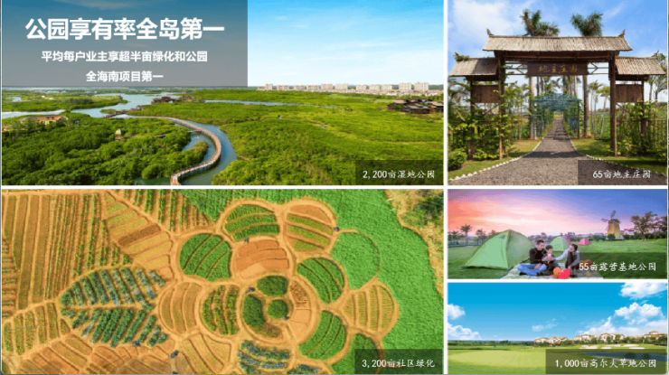2、公园享有率全岛第一:红树湾片区(2200亩湿地公园、65亩地主庄园、55亩露营基地公园、1,000亩高尔夫草地公园;3,200亩社区绿化),平均每户业主享超半亩绿化和公园,全海南项目第一
