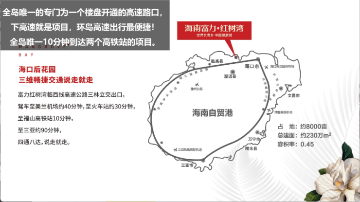 1、环岛高铁、环岛高速、环岛旅游公路,三线合“璧”,贯穿红树湾,海口西门户首站,全海南最便捷!