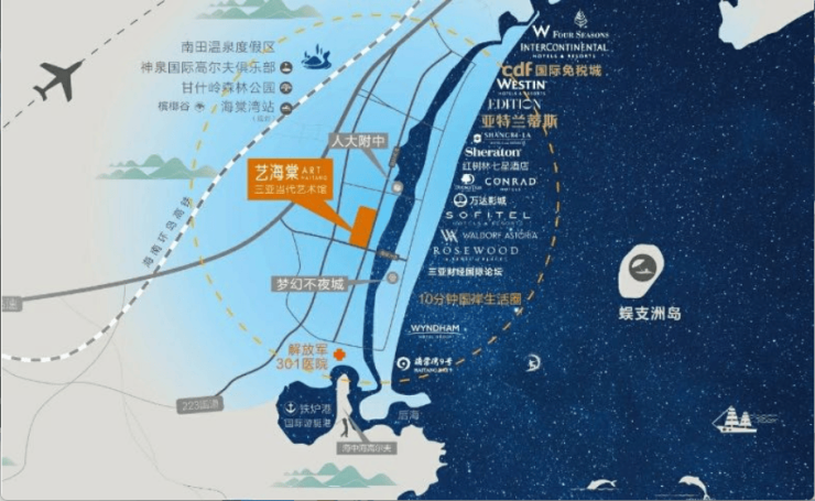 中国目前唯一艺术为主题的艺术商业综合体,涵盖三亚当代艺术馆、 艺术主题酒店、 艺术商业、 艺术美宅和艺术公园等丰富业态。
