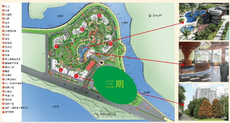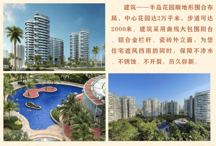 环境---半岛花园万泉河畔已建成长达数公里的带状公园,河面宽阔似湖,湖中几片沙洲构成小岛,河畔绿树婆娑成荫,轻风徐徐,水面波光粼粼。置身小道清歌漫步,恬然悠哉!
