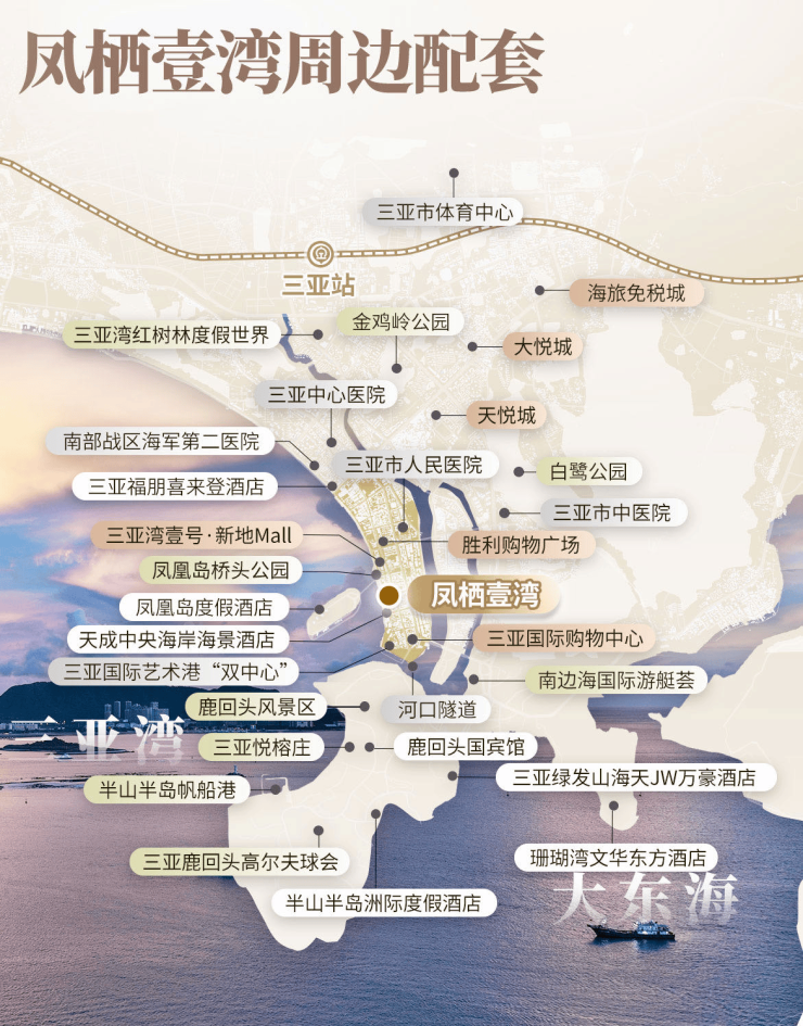 凤栖壹湾距河口隧道入口仅200米,便捷通往大东海片区鹿回头高尔夫,半山半岛帆船港等高端配套,双湾两岸,四通八达。
